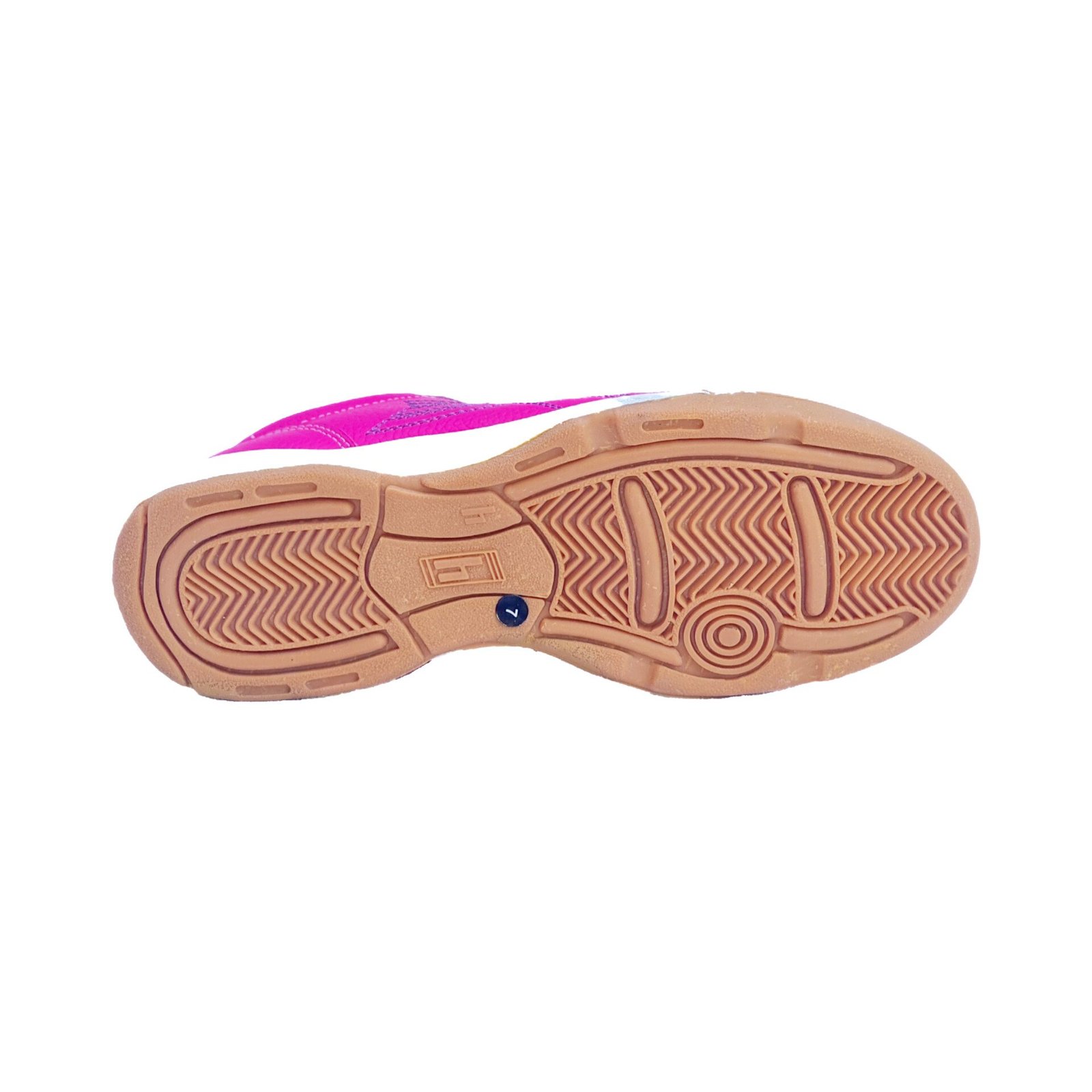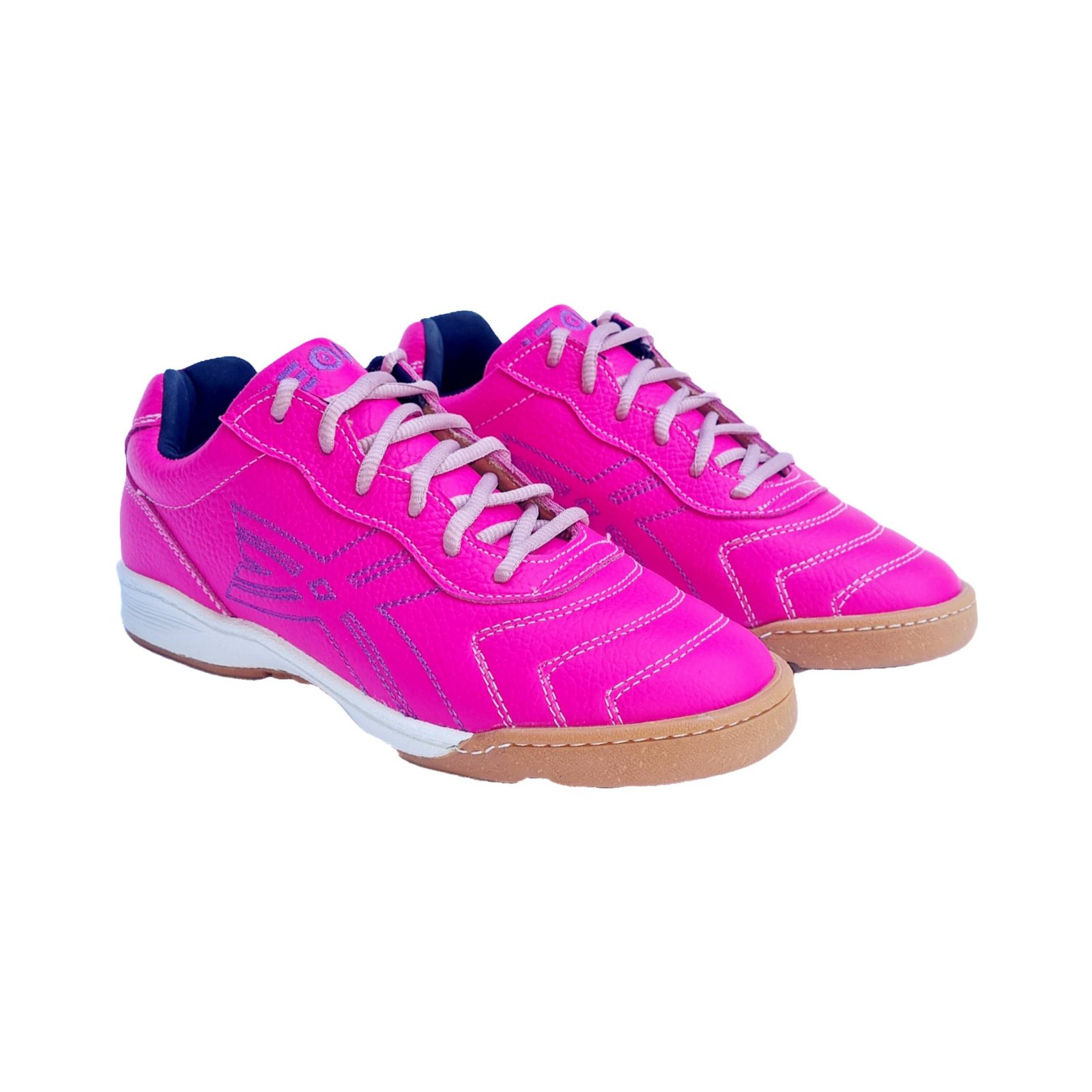 Botines Neon 5 de Fútbol sala. Cuero vacuno fuscia con detalles en violeta y rosa, suela de caucho para tracción óptima pegada y cosida para mayor durabilidad. Estilo y rendimiento en cada juego.